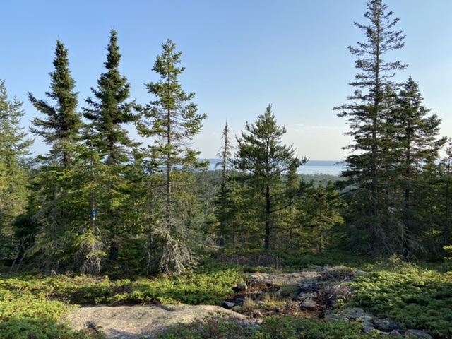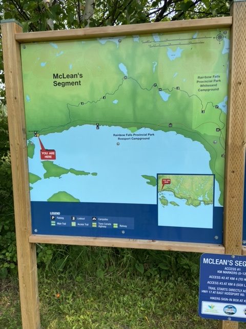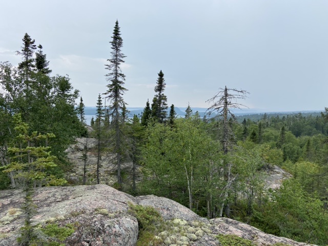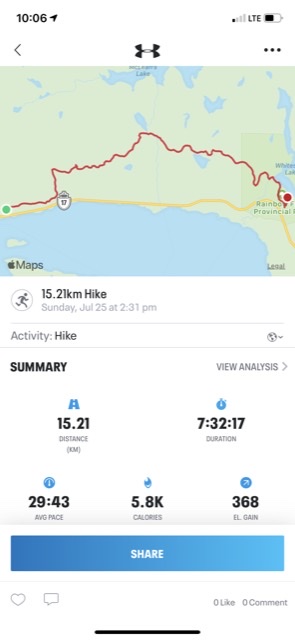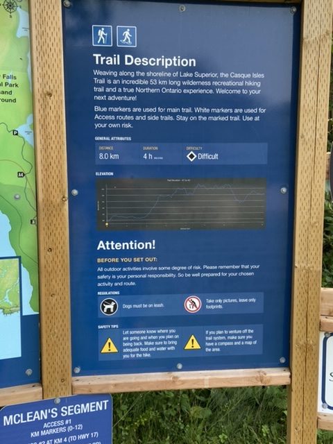 After driving from Sault Sainte Marie I arrived in Rossport around 2 in the afternoon. I checked that I had everything I needed for the hike, loaded up my pack at 23lbs, and headed out at about 2:20. The trail is relatively easy to follow with a few overgrown areas that you just have to watch out for. The trail starts out flat and I manges to maintain 3k/hr for the first couple of hours. The terrain then changed to a more rocky trail with lots of ups and downs to lookouts and streams. No sign of bears except for a big pile of bear scat right in the middle of the trail. That was the only sign of wildlife I saw. After seven hours of hiking I reached Rainbow Falls just in time to get a campsite before they closed. Setup my tent, grabbed a quick meal, had a shower, and collapsed into bed know I needed an early start for another 15km the next day.